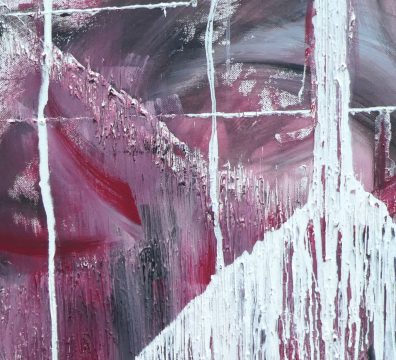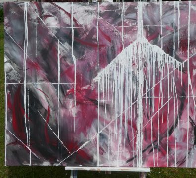 Der Hintergrund wurde bewusst dunkel gehalten (mit schwarz und rot sowie grau) – gleichwohl wurden einige Stellen ausgelassen. Die Struktur wurde mithilfe Marmormehr erstellt und musste einen Tag trocknen. Mithilfe von verschiedenen Pinseln wurde der Vordergrund bearbeitet. Als Abschluss kam weiße Farbe hinzu welche auch mit Spachtel aufgetragen wurde